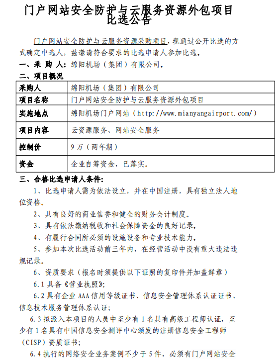 門戶網(wǎng)站安全防護與云服務(wù)資源外包項目比選公告