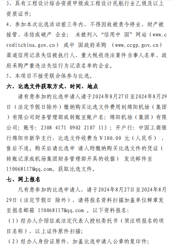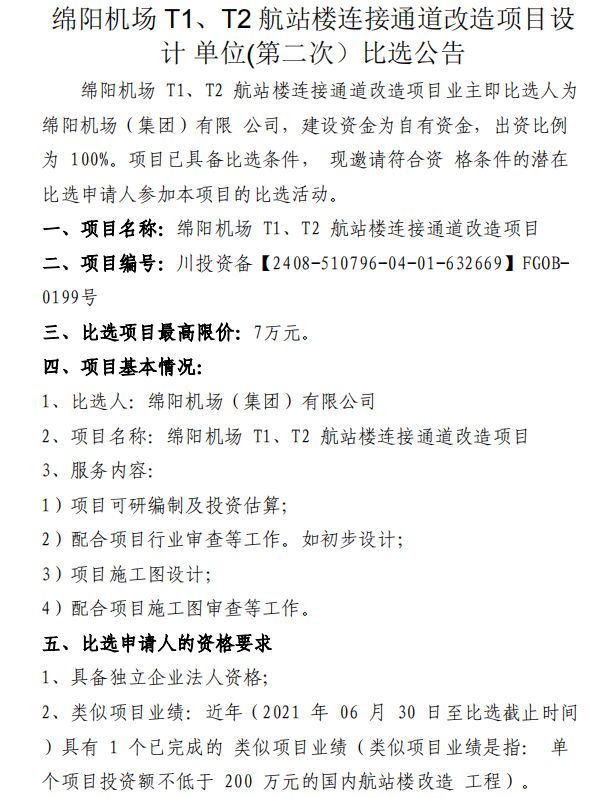 綿陽(yáng)機(jī)場(chǎng) T1、T2 航站樓連接通道改造項(xiàng)目設(shè)計(jì)單位(第二次)比選公告